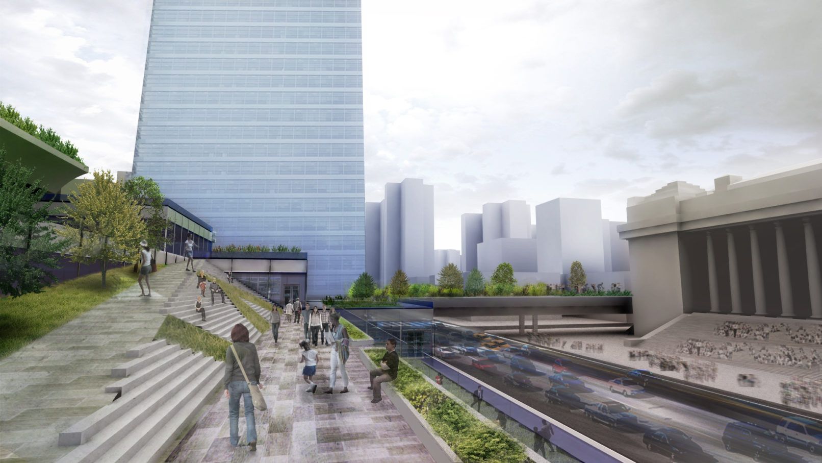 SHoP ARCHITECTS Expands the existing site with a lightweight concrete structure that is meant to evoke the old Penn Station and seeks to make the station a social meeting spot.